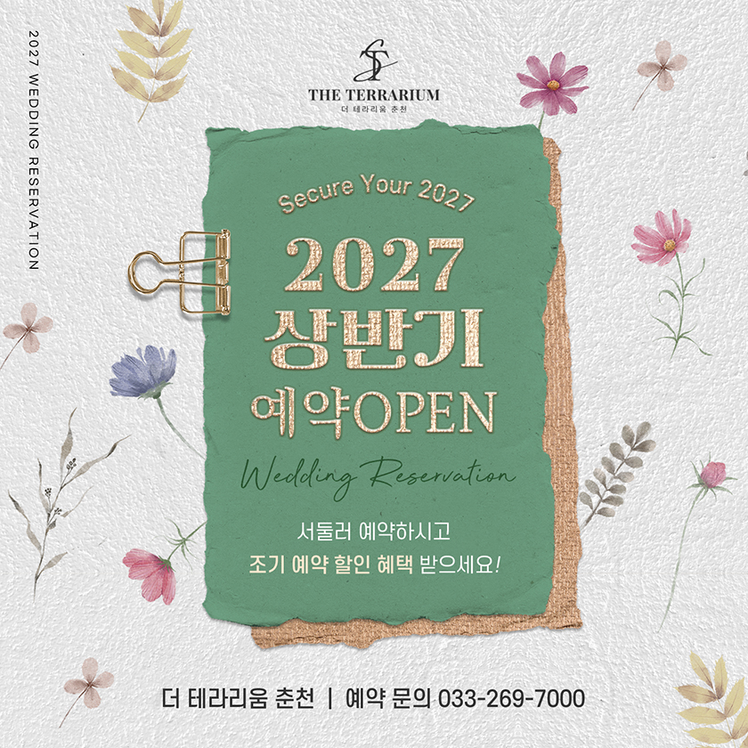 이벤트 상세 혜택 2027년 상반기 1월~6월 상담 오픈 기다리시던 27년 1월~6월 웨딩상담 예약이 오픈되었습니다. 이벤트 기간 : 2025/11/17 ~ 계속 TEL : 033-269-7000 이벤트 혜택 혜택 서둘러 예약하시고조기 예약 할인 혜택 받으세요~!자세한 사항은 예약실로 문의주세요.대표 전화 033-269-7000 이벤트 기간 2025/11/17 ~ 계속 목록 이전 이벤트 2026년 상반기 잔여타임 혜택 시그널 다음 이벤트 다음 이벤트가 없습니다.
