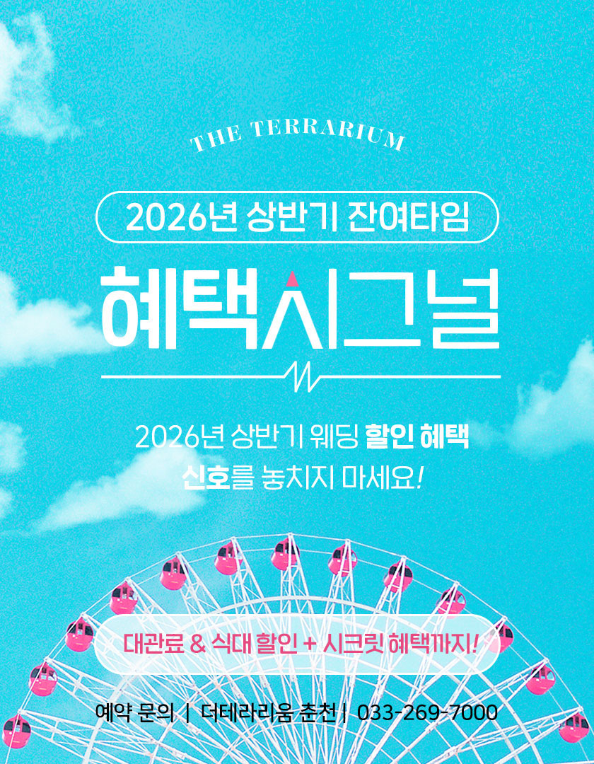 이벤트 상세 혜택 2026년 상반기 잔여타임 혜택 시그널 더 테라리움 춘천 2026년 상반기 웨딩할인 혜택 신호를 놓치지 마세요~ 이벤트 기간 : 2026/01/01 ~ 계속 TEL : 033-269-7000 이벤트 혜택 자세한 사항은 예약실로 문의주세요.대표 전화 033-269-7000 이벤트 기간 2026/01/01 ~ 계속 목록 이전 이벤트 기업연회, 송년회, 파티 예약 받습니다. 다음 이벤트 2027년 상반기 1월~6월 상담 오픈