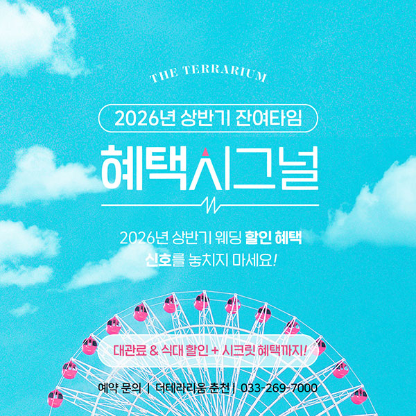 이벤트 상세 혜택 2026년 상반기 잔여타임 혜택 시그널 더 테라리움 춘천 2026년 상반기 웨딩할인 혜택 신호를 놓치지 마세요~ 이벤트 기간 : 2026/01/01 ~ 계속 TEL : 033-269-7000 이벤트 혜택 자세한 사항은 예약실로 문의주세요.대표 전화 033-269-7000 이벤트 기간 2026/01/01 ~ 계속 목록 이전 이벤트 기업연회, 송년회, 파티 예약 받습니다. 다음 이벤트 2027년 상반기 1월~6월 상담 오픈